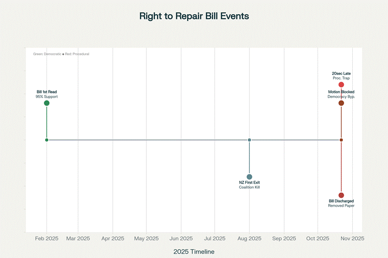 So when Davidson arrived twenty seconds late, they seized the opportunity. Pugh discharged the bill. Rutherford performed his outrage. National blocked reinstatement. And the legislation died without a vote, without a debate, without anyone having to publicly defend why manufacturers should be allowed to trap consumers through planned obsolescence.