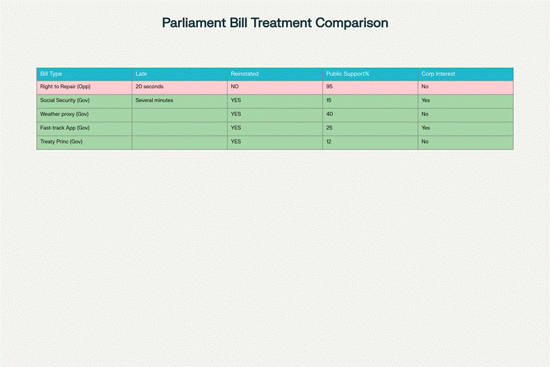 Twenty seconds. That is how long it took for a bill backed by 95 percent of public submissions to vanish from Parliament’s agenda. Not because anyone voted against it. Not because the government made a public case for why consumers should be locked into buying expensive replacements instead of fixing their own property. But because the National-ACT-NZ First coalition saw an opportunity to deploy parliamentary procedure as a weapon—and RNZ, the state-funded broadcaster that published this story, framed it as Davidson’s mistake rather than the coalition’s calculated assassination of democracy.