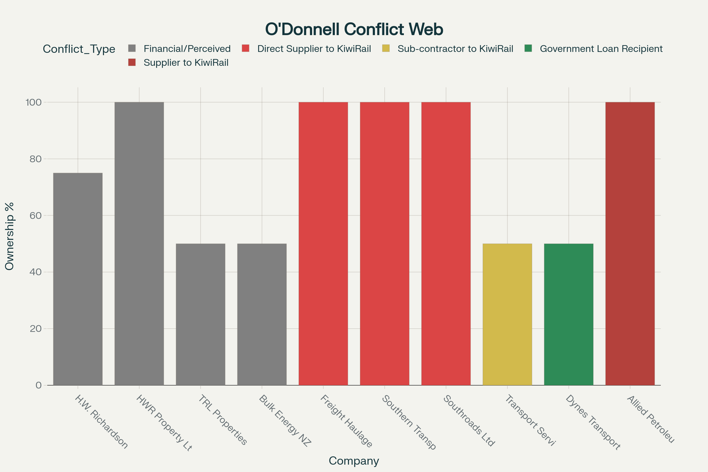 The brazenness of this arrangement becomes clear when examining the specific conflicts. O'Donnell's companies don't just compete with KiwiRail—they actively siphon business from the state-owned enterprise while he sits on its board. Freight Haulage Ltd operates rail sidings and supplies various goods to KiwiRail "at normal market rates"—a euphemism that masks the inherent corruption of having a board member whose companies profit directly from KiwiRail contracts. Southern Transport Company Ltd contracts with KiwiRail for bulk goods transport, while Transport Services Southland Ltd serves as a sub-contractor, carting coal when rail lines are down.