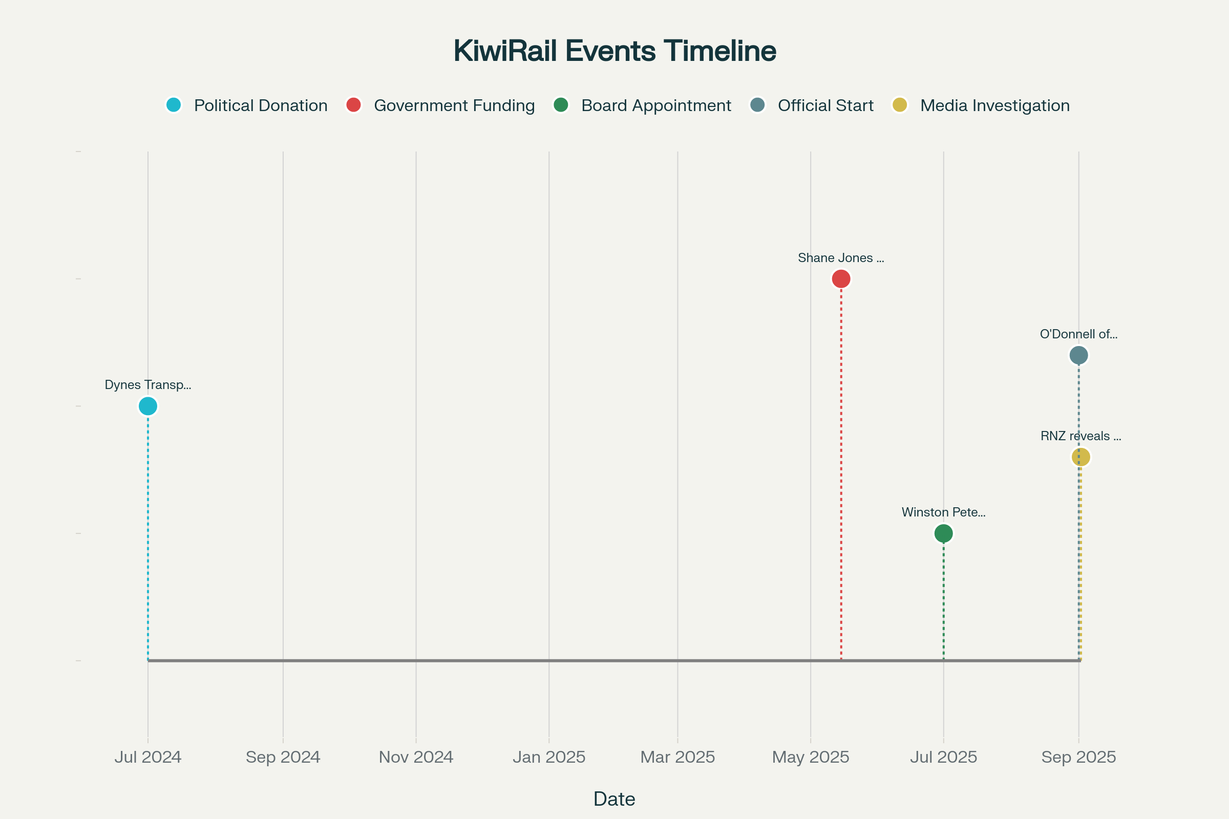 The timing of key decisions—from the NZ First donation in July 2024 to the government loan announcement in May 2025 to O'Donnell's appointment in July 2025—reveals a coordinated campaign to monetize political influence. This represents not isolated corruption but systematic policy capture by vested interests.