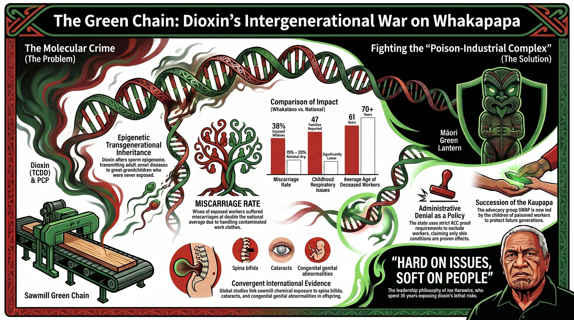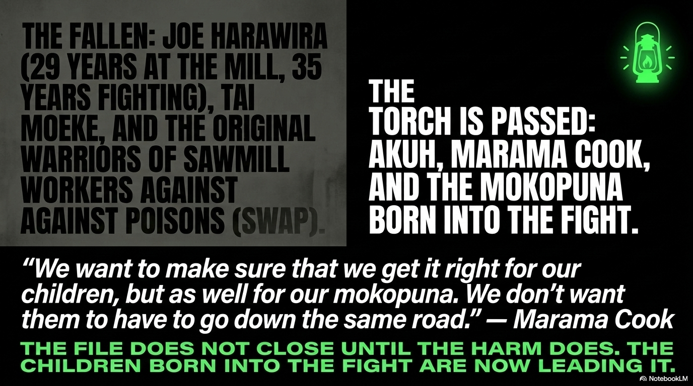 The implication should end the argument about whether this is historical harm. People being born today into Ngāti Awa whānau with this exposure history carry a biochemical legacy from a sawmill that closed in 1988. Their great-grandparents were sent to work without adequate protection. Their great-grandmothers washed the clothes. The dioxin entered the epigenome. The epigenome was inherited.