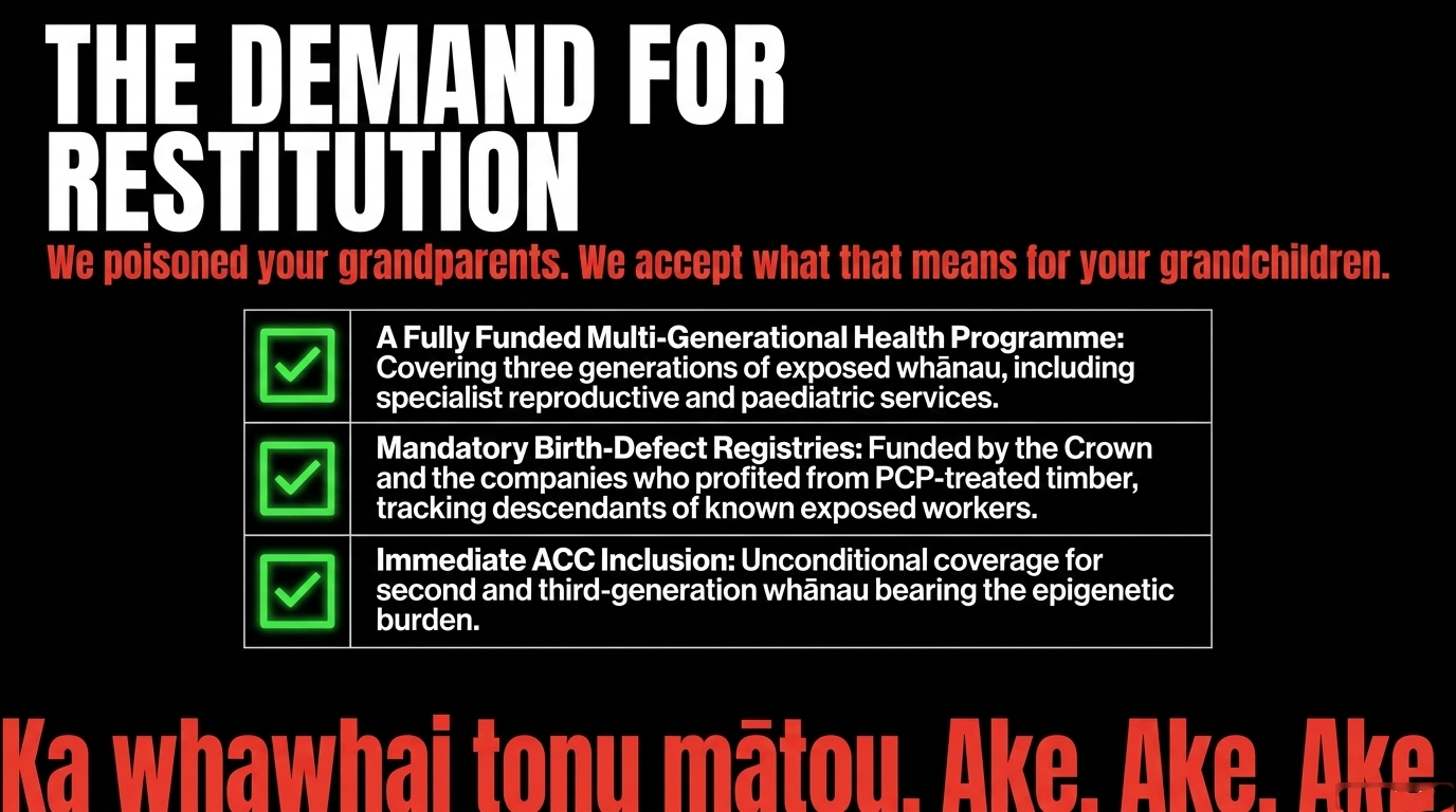 Solution: A fully funded multigenerational health programme covering three generations of exposed whānau, specialist reproductive and paediatric services, and immediate inclusion of second and third-generation whānau in ACC entitlements.