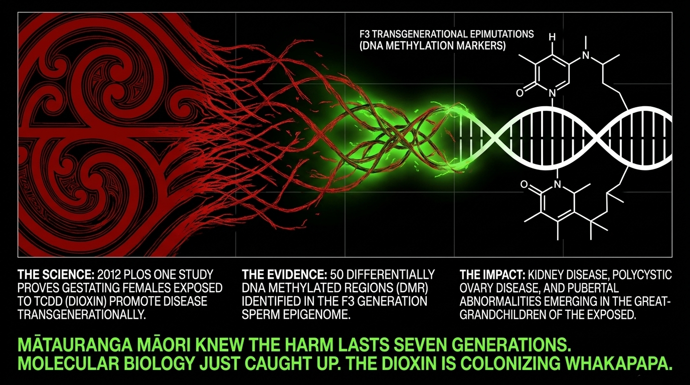 Māori always understood that what you do now shapes what your mokopuna carry. The PLOS ONE study showed that gestating females exposed to dioxin TCDD promoted heritable sperm epigenome alterations across three subsequent generations, with disease appearing in the great-grandchildren. The Seveso cohort called for further research on descendants given the heritable epigenetic signal in the literature.