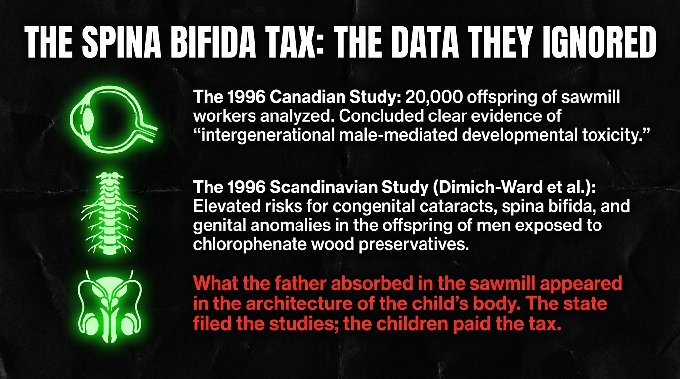 A 1996 Canadian study of 20,000 offspring of sawmill workers found increased risks of congenital abnormalities of the eyes and genital organs, as well as higher incidence of spina bifida, as cited by WSWS and the NZ OSH health outcomes report. The study's conclusion supported intergenerational male-mediated developmental toxicity, as cited by WSWS. In plain language: what the father absorbed in the sawmill appeared in the architecture of the child's body.