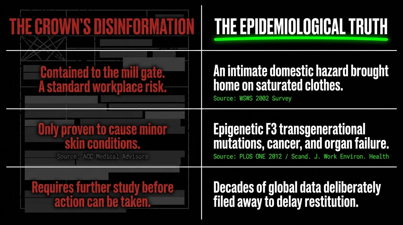 The state knew about domestic transmission pathways. It continued to describe the problem as a workplace issue. That definitional trick — confining the harm to the mill gate — was one of the most cynical pieces of administrative self-protection in this entire history.