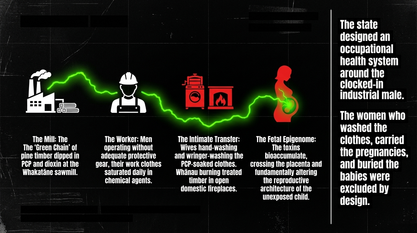 The sawmill at Whakatāne did not just poison workers. It poisoned the intimate architecture of reproduction itself. Workers and their families suffered reproductive illnesses and birth defects, many couples endured numerous miscarriages and ectopic pregnancies, and others had children and grandchildren with learning difficulties, birth defects, and infertility, as recorded by Te Ara. That is not collateral damage from an industrial accident. That is compound interest on a colonial crime — paid across generations in bodies the state chose never to count.