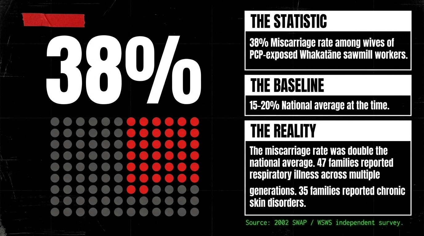 A 2002 survey of former Whakatāne sawmill workers and families of deceased workers found that 38 percent of the wives surveyed had experienced a miscarriage, while the national average at the time was 15 to 20 percent, as reported by WSWS. That means the miscarriage rate among wives of PCP-exposed sawmill workers was roughly double the national rate.