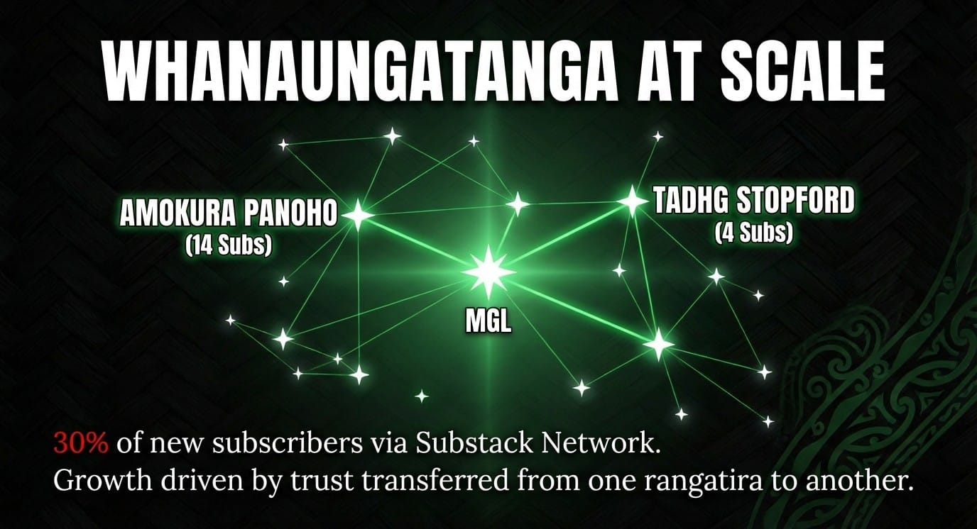 Thirty percent of my new subscribers arrived this way—not through algorithm, not through paid promotion, but through the simple, powerful act of one whānau member recommending another to their own people.