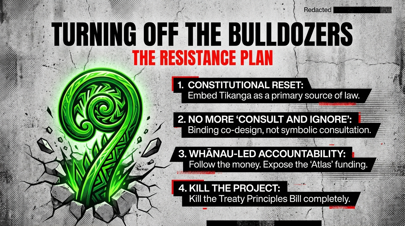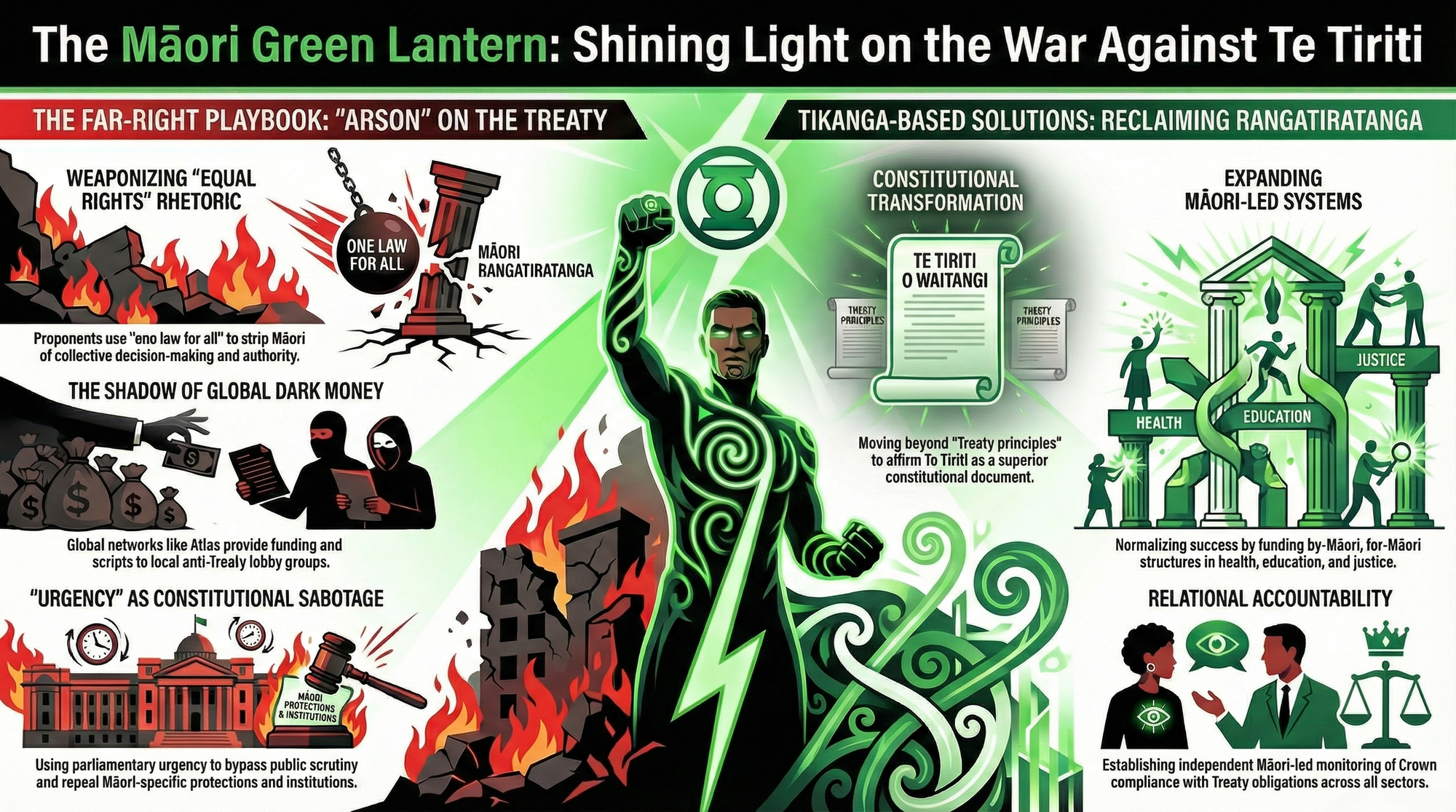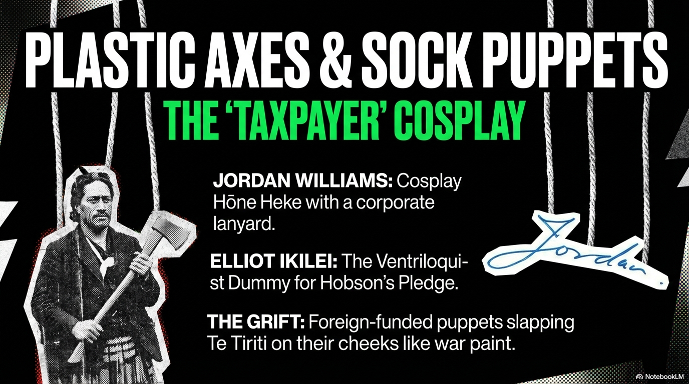 “Fire at the Treaty House” pulls the camera back again and shows the whole set: Atlas money, ACT’s Treaty Principles Bill, National’s culture war on Te Tiriti, Hobson’s Pledge’s racist ad campaigns, and the Taxpayers’ Union’s relentless attacks on public goods all feeding the same inferno. Fire at the Treaty House – Exposing the Atlas Network’s War on Te Tiriti – The Māori Green Lantern traces direct lines from Atlas training and funding into ACT, the New Zealand Initiative, and the Taxpayers’ Union, then out again into campaigns that normalise Elliot’s “one people” nonsense and Jordan’s “taxpayer hero” cosplay. In that whakapapa, Ikilei and Williams are not just pathetic; they are replaceable parts – interchangeable kākā tarahae whose only purpose is to repeat the lines and soak up the blame while the real architects of dispossession keep their hands clean.