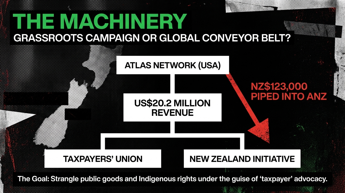 Strip away the email varnish and the pattern is obvious: Jordan and Elliot are two sock puppets on the same colonial arm. The hand belongs to the Atlas‑style ideology that frames any collective right, any Indigenous authority, any public infrastructure as an obstacle to “freedom” – meaning freedom for capital to roam and extract. The Public Service Association’s research shows Atlas is a multi‑million‑dollar machine devoted to seeding such outfits worldwide – seminars, mentoring, funding, all to build an echo chamber of “taxpayer” and “equality” groups whose job is to strangle public goods and Indigenous rights. PSA maps that network. ABC’s investigation into Atlas in Australia and New Zealand identifies at least two Atlas partners here – the Taxpayers’ Union and the New Zealand Initiative – and notes that Atlas‑linked think tanks have been active around referendums and indigenous rights debates across the Tasman. ABC joins the dots.