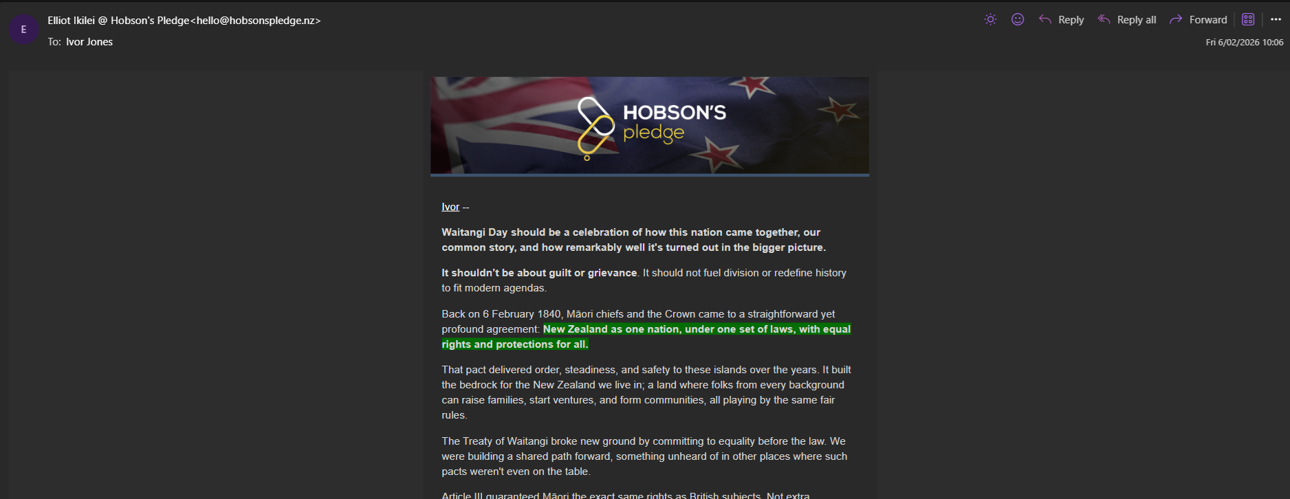 If Jordan is the cosplay rebel, Elliot is the discount motivational speaker hired to sell the same colonial script in softer lighting. His email reads like it was written by ChatGPT fine‑tuned on Don Brash’s Orewa speech: “one nation, one people, one law”, the Treaty as a “straightforward pact”, any Māori rights beyond the bare minimum dismissed as racist “division”. This is not an accident; it is the entire mission statement of Hobson’s Pledge. That lobby group, led by Brash, was formed explicitly to oppose affirmative action for Māori, abolish Māori electorates, scrap the Waitangi Tribunal and “remove all references in law and in Government policy to Treaty ‘partnership’ and ‘principles’”. Wikipedia lays their goals out line by line.