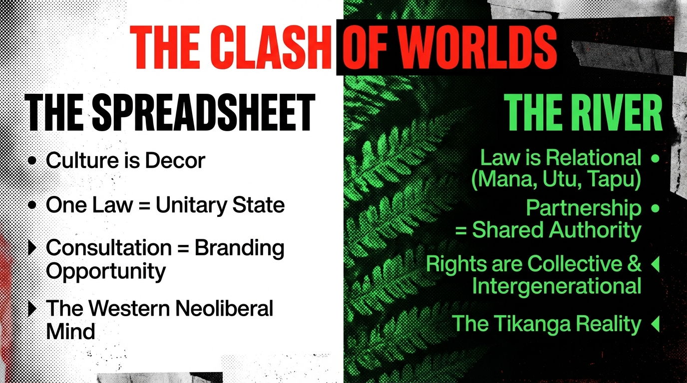 For western readers who struggle with tikanga, use this frame: tikanga is to Aotearoa what constitutional norms and unwritten conventions are to Westminster democracies – the deep rules behind the formal rules. When someone tramples tikanga, it’s not “just culture”; it is the equivalent of rewriting a constitution by stealth. Jordan and Elliot are the local equivalents of think‑tank hacks who insist the US Constitution was colour‑blind in 1787 and that any attempt to recognise structural racism is “un‑American”.