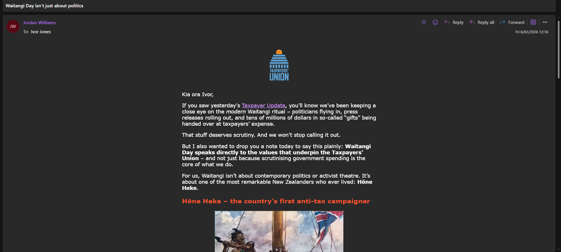 Jordan’s email is an act of historical grave‑robbing: he raids Hōne Heke’s urupā, steals the axe, files the blade down to a Taxpayers’ Union logo, and swings it not at the Crown but at teachers, nurses, and Māori communities trying to survive Crown‑engineered poverty. Hōne Heke fought a colonial state that weaponised tariffs to choke Māori trade; Te Tiriti in te reo guaranteed rangatira “te tino rangatiratanga” – chieftainship over their lands, villages and taonga – while the Crown was given a limited right to manage land transactions, not a blank cheque to loot and tax Māori economies into dust, as laid out in Te Ara’s Treaty overview. Te Ara makes that crystal clear.