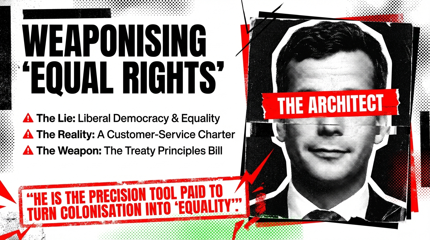 The three earlier essays form the wider battlefield Jordan and Ikilei stumble around in, swinging plastic swords while their Atlas patrons and coalition politicians do the real structural damage. In “David Seymour’s War on Te Tiriti”, you have already mapped how Seymour’s Treaty Principles Bill is an Atlas‑style wrecking ball aimed at deleting tino rangatiratanga from law and replacing it with a fake “one law for all” formula – the exact script Elliot parrots in his Hobson’s Pledge email, right down to the denial that Māori ever held distinct constitutional status. David Seymour’s War on Te Tiriti – The Māori Green Lantern shows Seymour’s Atlas training, his Bill’s collision with Waitangi Tribunal jurisprudence, and the way “equality” rhetoric is weaponised to extinguish Māori authority; Elliot simply repackages that as a sentimental Waitangi sermon and pretends it’s grassroots wisdom.