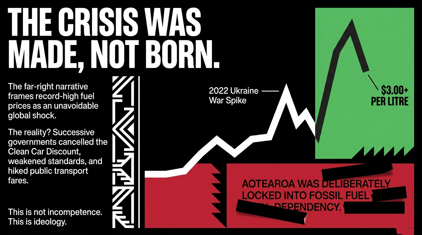 The current fuel price spike is not an act of God. It is the consequence of geopolitical conflict in the Middle East disrupting global oil supply — a supply system Aotearoa's successive neoliberal governments have refused to wean us off for three decades. As 1News reported on 23 March 2026, fuel prices have now outpaced the last time New Zealand surpassed $3 per litre — which was following Russia's invasion of Ukraine in 2022.
