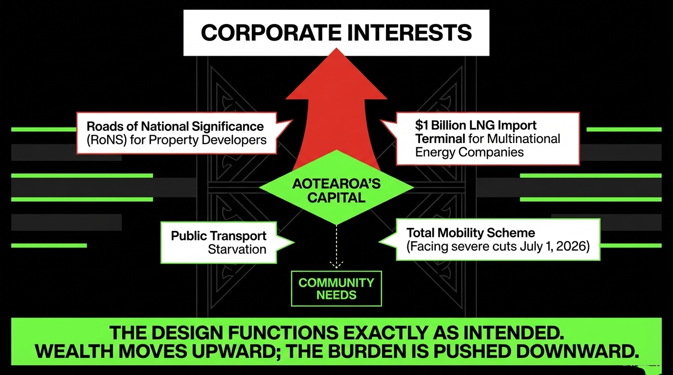 The Roads of National Significance are the crown jewel of the National Party's transport theology — a multi-billion-dollar highway programme overwhelmingly concentrated in and around Tāmaki Makaurau (Auckland), designed to move private cars faster while public transport is starved of capital. The LNG import terminal — a proposal to lock Aotearoa into another fossil fuel import dependency just as the world is pricing itself off the stuff — serves energy corporations, not communities.