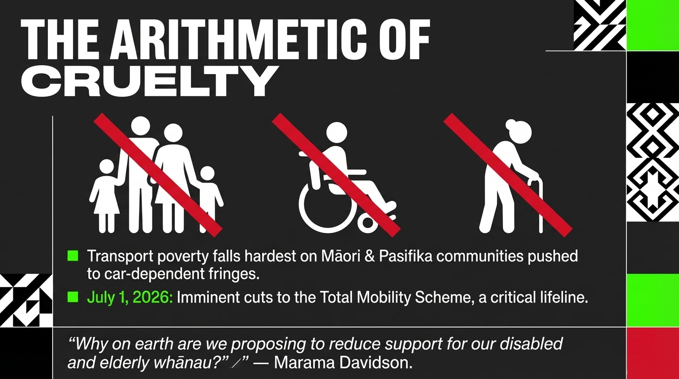 Meanwhile, the Total Mobility Scheme — targeted for cuts set to begin 1 July 2026, and which co-leader Marama Davidson calls out by name — is the lifeline for disabled and elderly New Zealanders, a disproportionate number of whom are Māori.