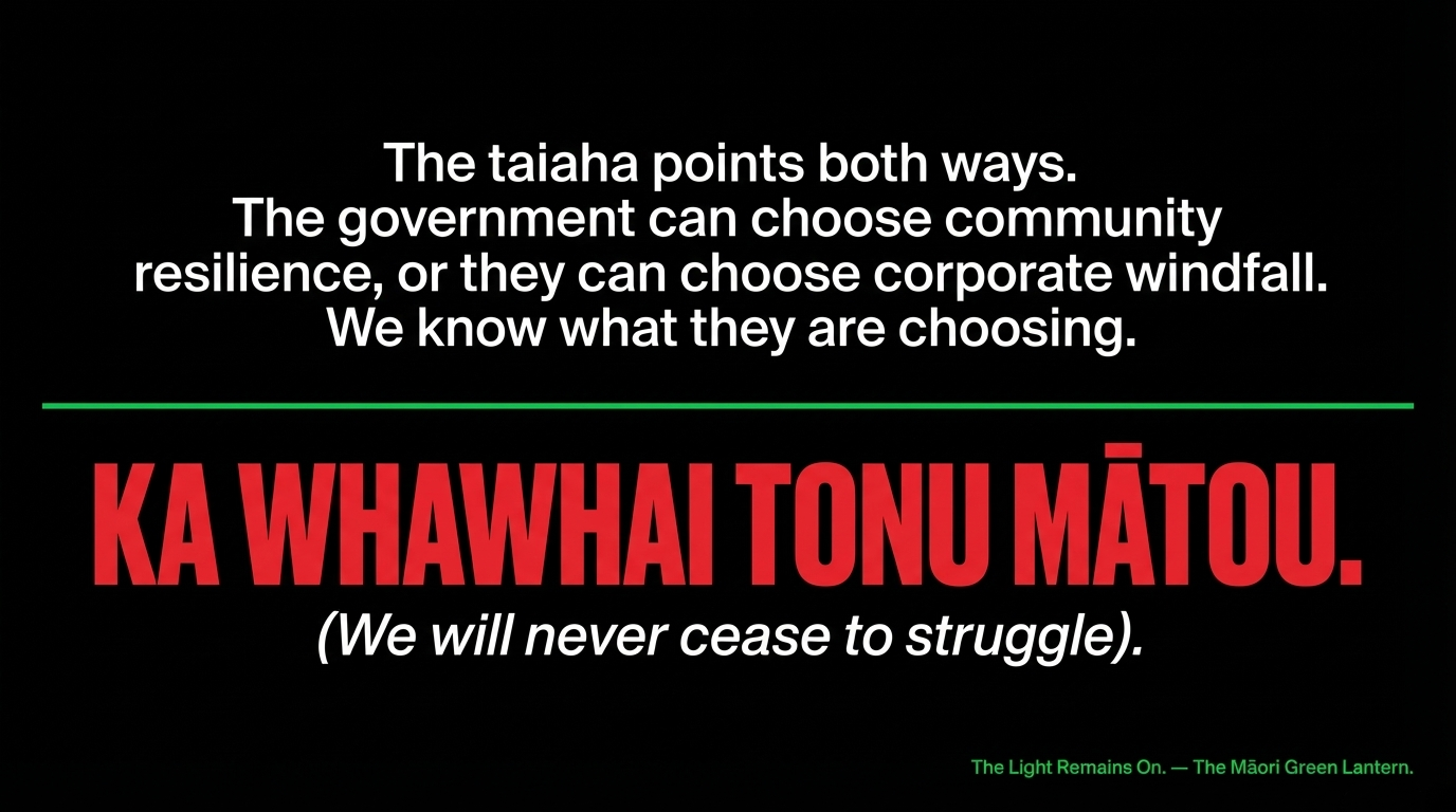 The taiaha swings where the evidence points. The evidence points to a government that has, at every turn, chosen corporate infrastructure over community resilience, fossil fuel dependency over energy sovereignty, and managed austerity for disabled and elderly people over windfall taxes on corporations making record profits from crisis.