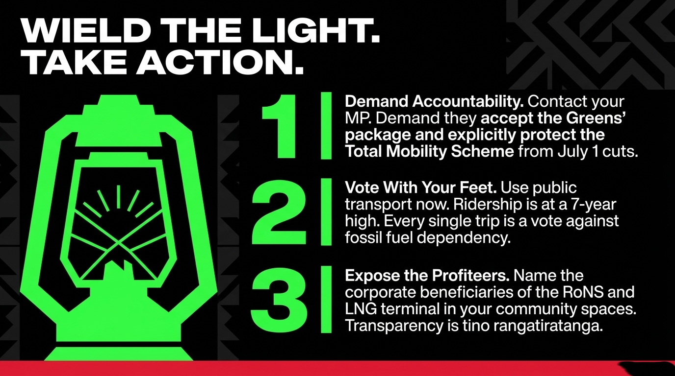 - Name the corporate beneficiaries of the LNG terminal and RoNS in your community conversations — transparency is a form of tino rangatiratanga