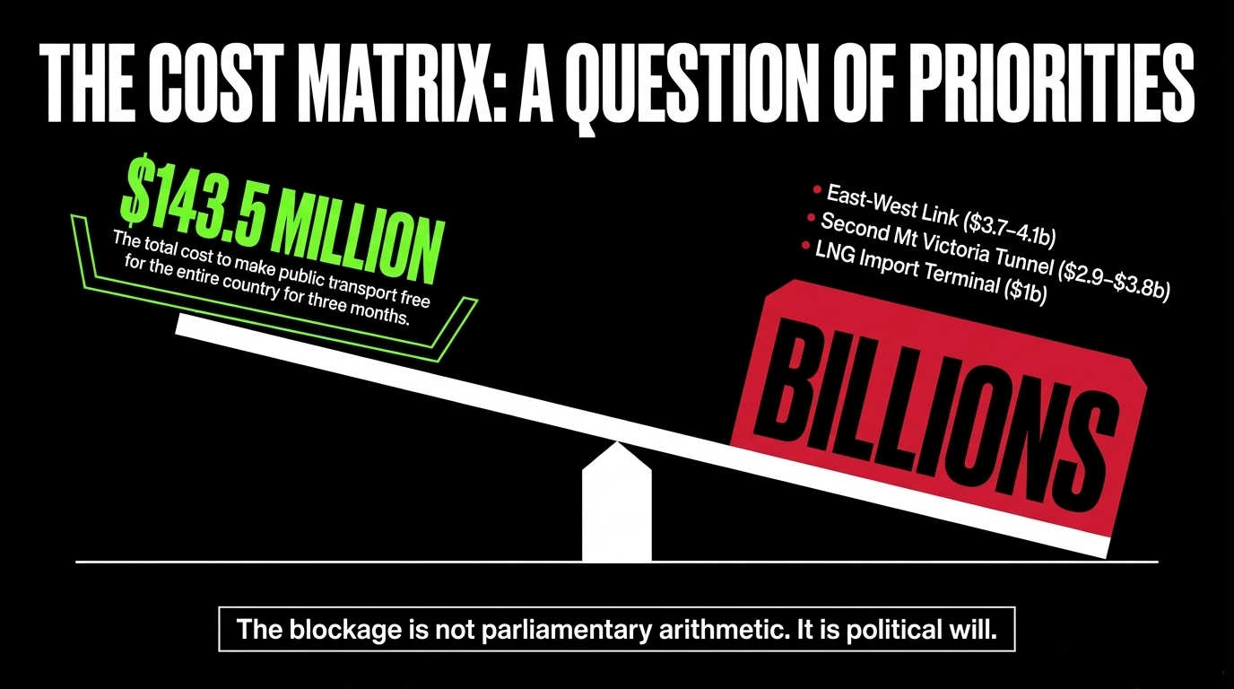The pathway is clear. The blockage is not parliamentary arithmetic. It is political will — specifically, Luxon's reluctance to implement a windfall profits tax and redirect infrastructure spend away from the RoNS constituency.