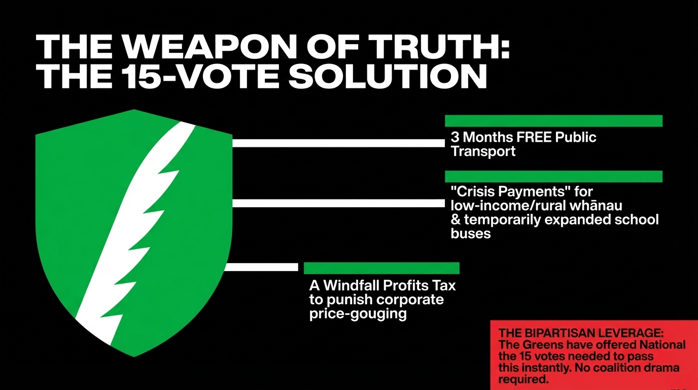 The proposal, as reported by RNZ, includes free public transport for three months, relief payments for low-income and rural people, expanded school bus eligibility, reversal of cuts to the Total Mobility Scheme, increased mileage rates for care and support workers, and a windfall profits tax on fossil fuel corporations gorging themselves on manufactured scarcity.