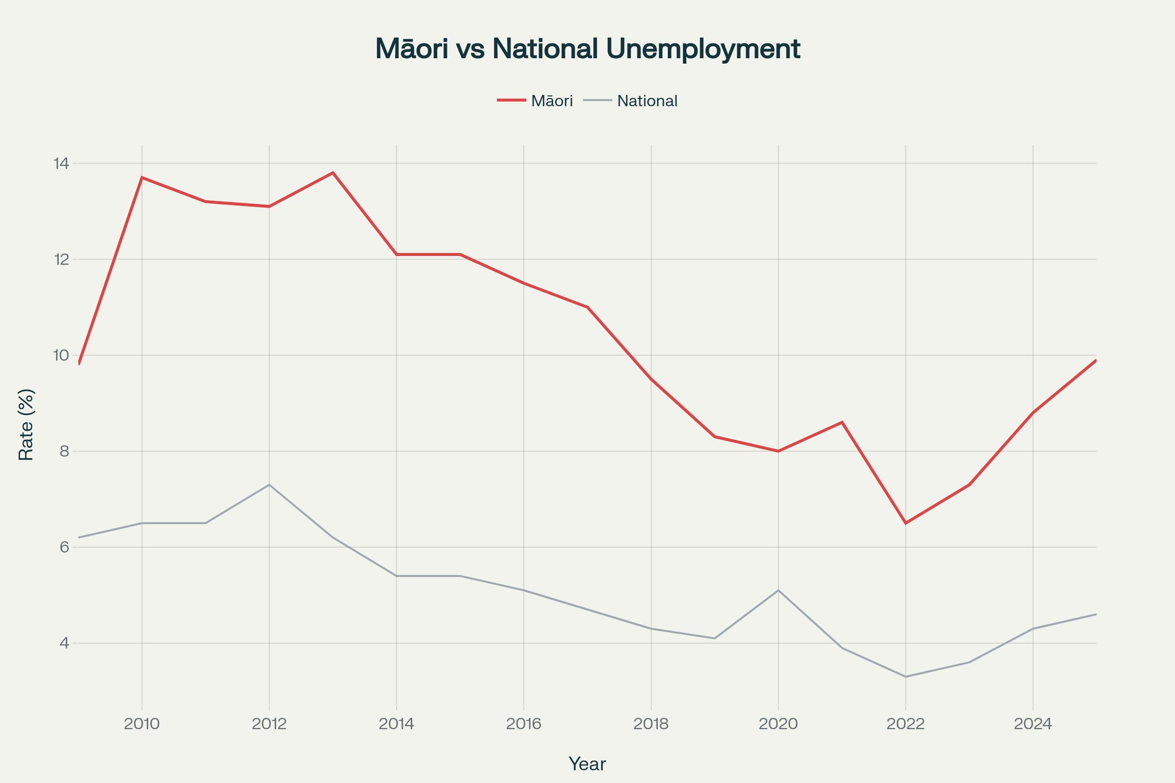This chart shows how Māori unemployment consistently exceeds the national average, with the gap widening significantly during austerity periods (2010-2013) when Māori unemployment peaked above 13%. Data sourced from Stats NZ and Figure.nz verified sources