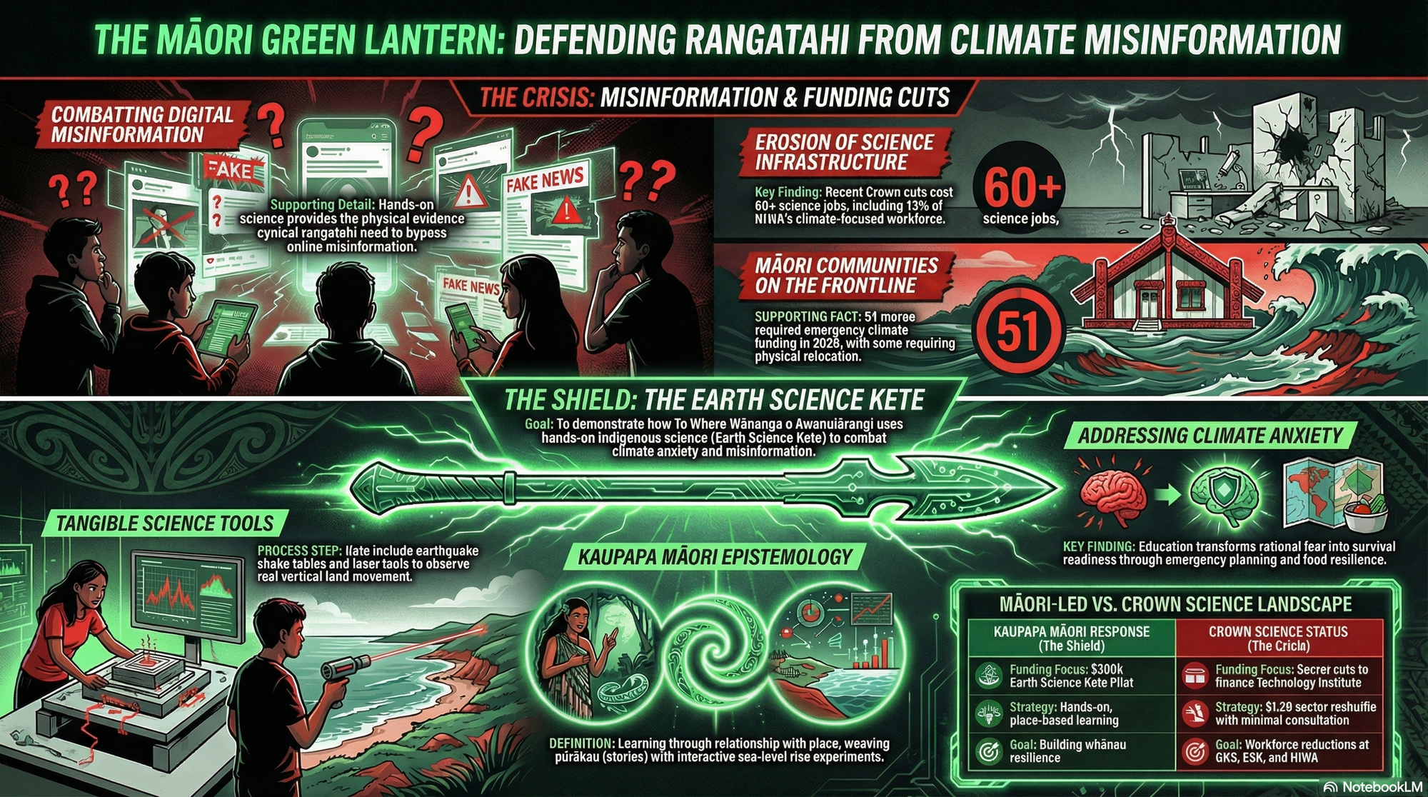 The Wānanga explicitly names climate anxiety as a target of the kete kaupapa. This is significant. Climate anxiety among rangatahi Māori is not psychological fragility — it is a rational response to material reality: your whenua is flooding, your moana is rising, and your government is cutting the science budget.