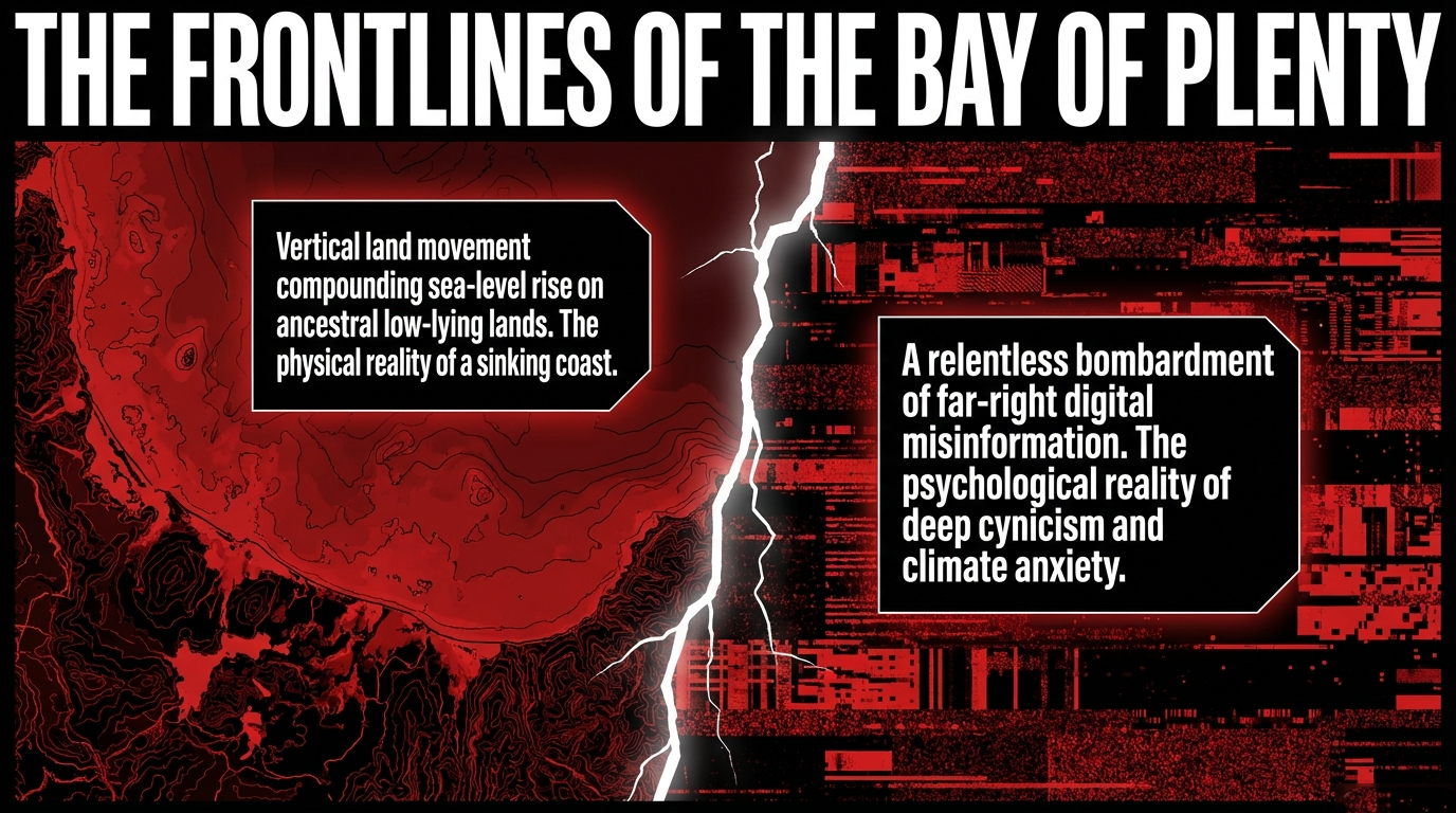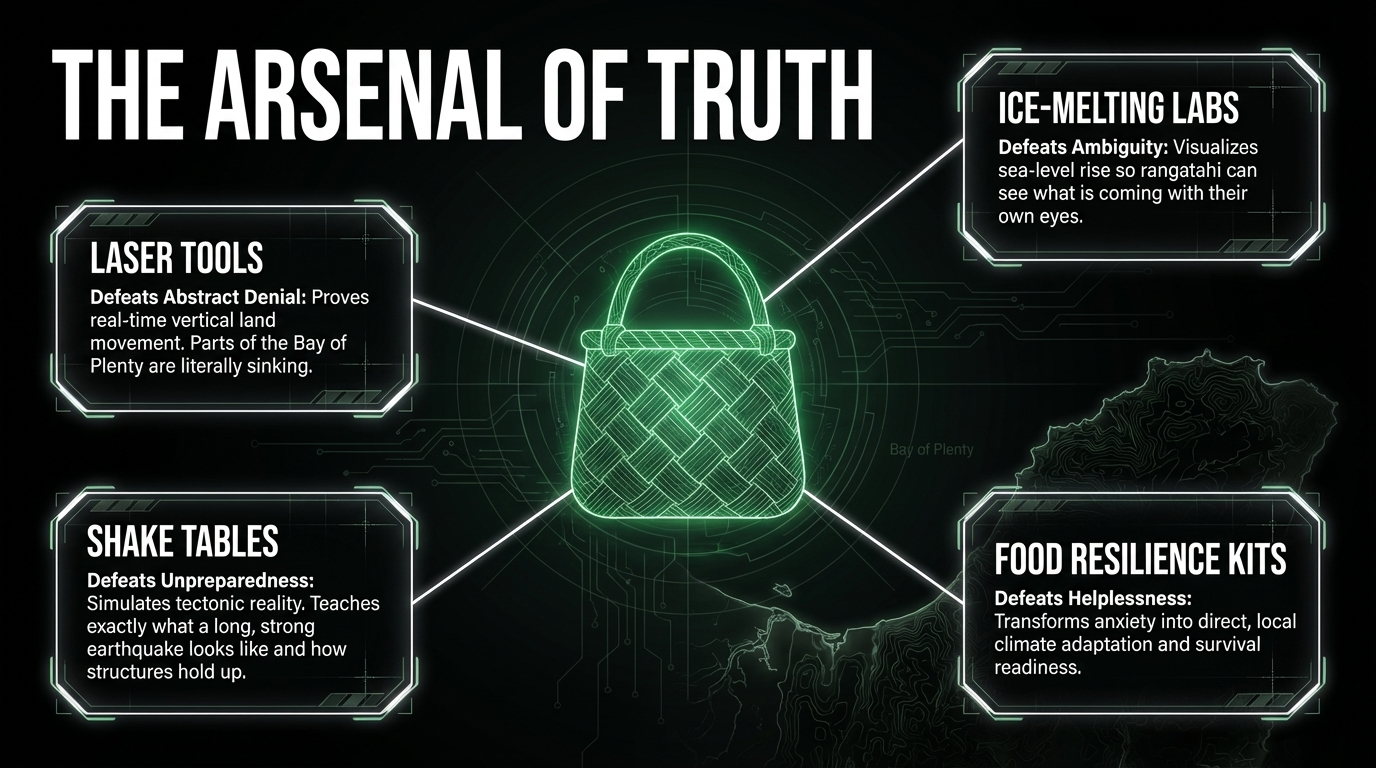 The Bay of Plenty is not chosen arbitrarily. Māori communities are on the frontline of coastal change in this rohe, with vertical land movement compounding sea-level rise across low-lying ancestral coastal lands. The laser tools measuring land movement in the kete are not academic exercises — parts of the Bay of Plenty coastline are sinking. Crown infrastructure investment in high-risk coastal zones has historically protected Pākehā-dominated beach settlements while Māori coastal marae are left to face the sea.