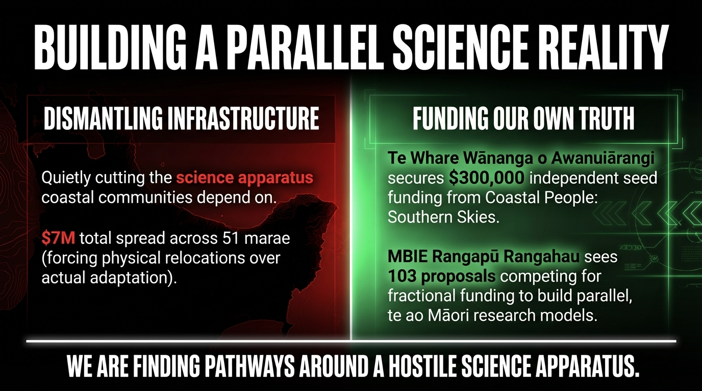 This is not an isolated grant. The MBIE Rangapū Rangahau 2026 funding round awarded the Te Wai Haapuapua project — a partnership between Waikato-Tainui and Bioeconomy Science Institute — to develop a te ao Māori model of wet farming (paludiculture) as a strategy for climate resilience along the lower Waikato River. MBIE confirmed the 2026 round received 103 proposals, signalling growing pressure on a severely underfunded mechanism. A pattern is forming: Māori institutions are building a parallel research infrastructure because the Crown's own apparatus is failing them.