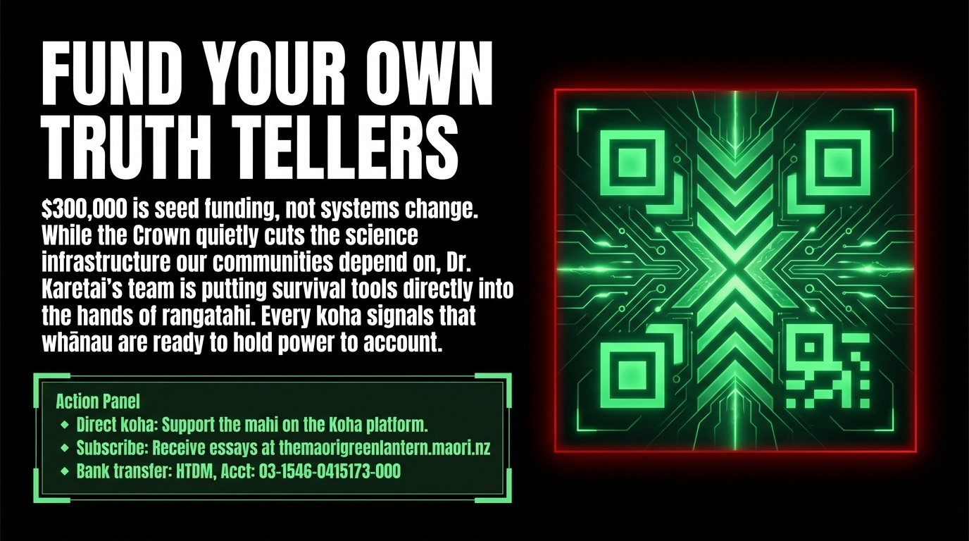 This essay exists because that story deserves to be told with clarity and without corporate interference. Every koha signals that whānau are ready to fund their own truth tellers — that rangatiratanga includes the power to hold power to account.