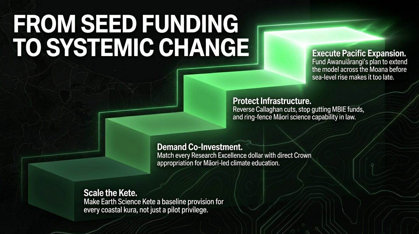 The kete model, if properly funded, could scale into every coastal kura across Aotearoa and the Pacific. But $300,000 is seed funding, not systems change. Here is what must happen: