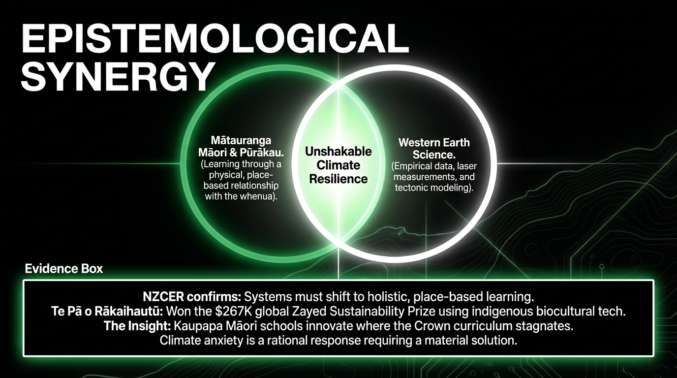 NZCER's research Ki te ako āhuarangi tōnui ki Aotearoa | Towards Flourishing Climate Education in Aotearoa New Zealand identifies the exact approaches needed: foregrounding holistic, cross-curricular, and place-based learning; shifting from individual to collective action; and making school systems climate-resilient. The Earth Science Kete does all three simultaneously. The Crown curriculum does not.