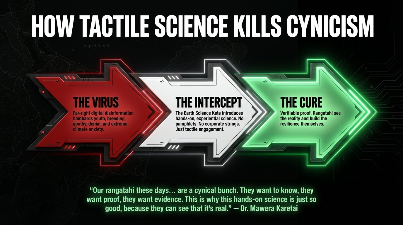 The Earth Science Kete is mahi tūturu — real work, grounded work, urgent work. It weaves mātauranga and western science not as a compromise but as an assertion: we have always known this land, and now we will teach our tamariki to know it again, with every tool available.