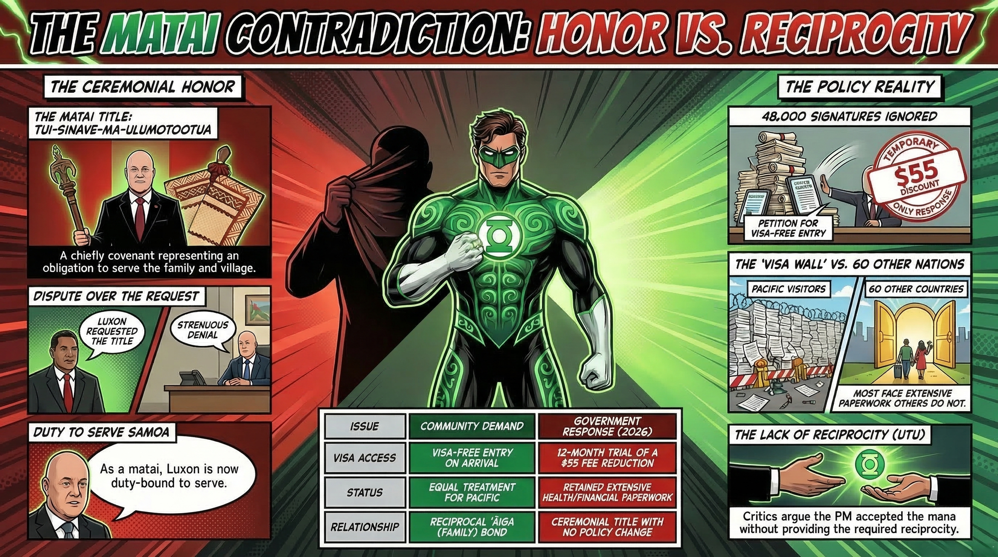 Every Pacific New Zealander, every Samoan whānau waiting months for a visa, every kaumātua who had to fill out a health form to attend their mokopuna's tangi — they now have standing to invoke Luxon's own title back at him. Tui-Sinave-ma-Ulumotootua. Whatever those words mean to the village of Apia, they now carry the weight of the 48,000 signatures that preceded them.