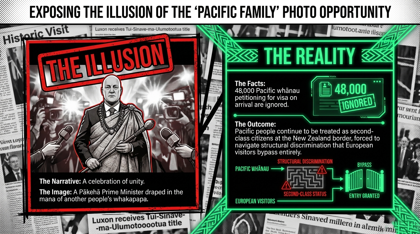 But before the kava bowl was even filled, Samoa's own Prime Minister had already called him out — publicly, on livestream, in front of the Pacific — and the contradiction at the heart of this visit lay bare: 48,000 signatures from Pacific whānau asking for equal treatment at the border, as documented by RNZ, answered with a $55 visa discount and a borrowed chiefly name.