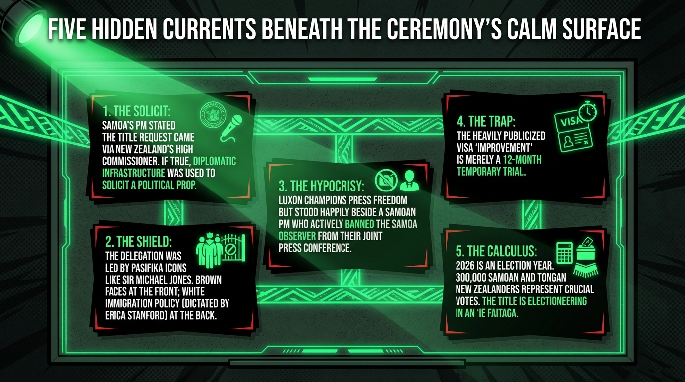 As 1News reported in January, 2026 is a New Zealand election year. Pacific leaders across the region have been consistent and vocal: as Pacific Media Network reported, Samoa has backed visa-free travel while rejecting New Zealand government fears about mass migration as unfounded. There are over 300,000 Samoan and Tongan New Zealanders whose votes matter, as noted by RNZ. A matai title photographs well. It reaches the Pasifika community pages. It signals belonging without delivering anything. This visit was not diplomacy first. It was electioneering in a finely woven 'ie faitaga.