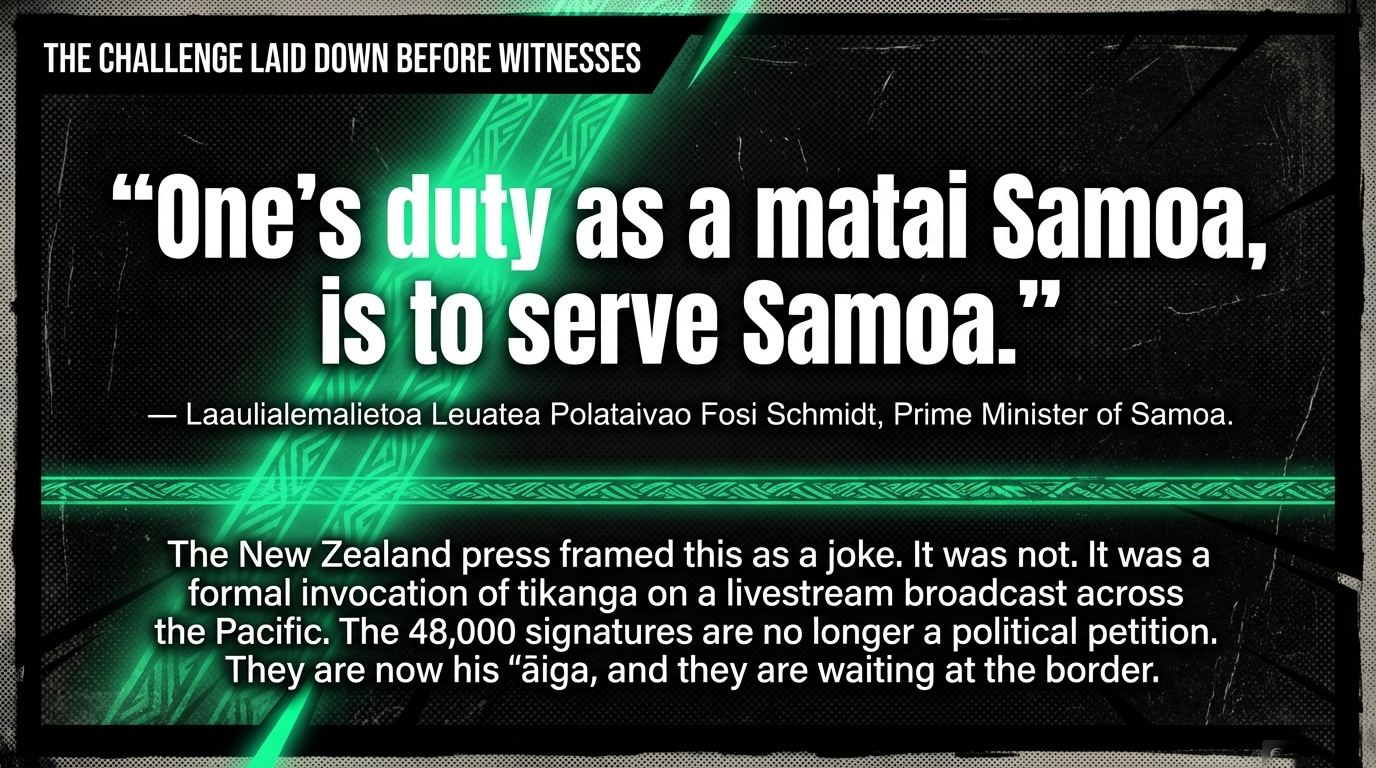 Laaulialemalietoa has publicly invoked it. He said on record, in a livestream seen across the Pacific, that as a matai, Luxon's duty is to serve Samoa, as captured by both 1News and Samoa Global News. That kōrero now lives in the public record. It cannot be undone by a spokesperson's denial. The New Zealand government may try to frame this as a joke — "Laaulialemalietoa joked" is the exact framing used in the 1News coverage. But in the Pacific, when a PM invokes the obligations of a chiefly title in a formal media setting, before his own people, that is not a joke. That is a challenge laid down with witnesses.