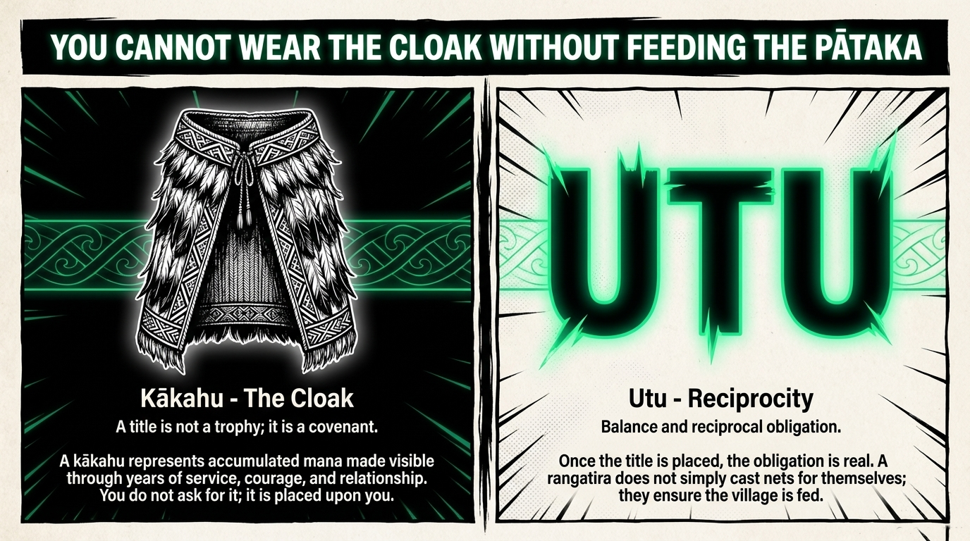 Ka hao te rangatahi — the net of the youth draws in all things. But a rangatira does not simply cast nets. They fill the pātaka. They ensure the village is fed.