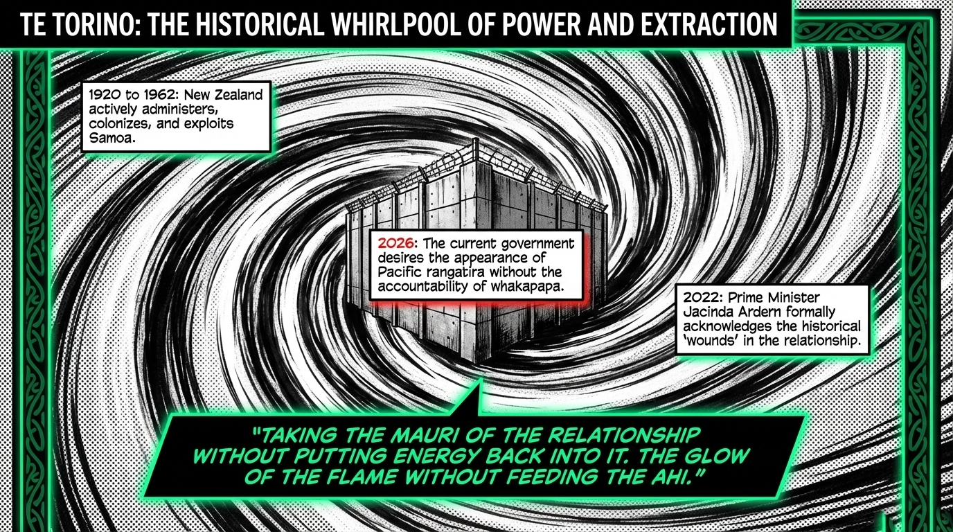 Luxon wants the appearance of Pacific rangatira. He wants the title, the ceremony, the photographs. But the pātaka he controls — immigration policy, visa settings, economic access — remains locked, or barely cracked open, to the very people whose ancestors his government's predecessors administered, colonised, and exploited for four decades. New Zealand administered Samoa from 1920 until independence in 1962, a history recorded by Te Ara — The Encyclopedia of New Zealand. That is a history Jacinda Ardern formally acknowledged in Samoa in 2022, speaking of "wounds" in the relationship, as RNZ reported. Luxon has made no such acknowledgement in this visit's framing. Instead, he speaks of "Pacific family" — the warmth of family without the accountability of whakapapa.