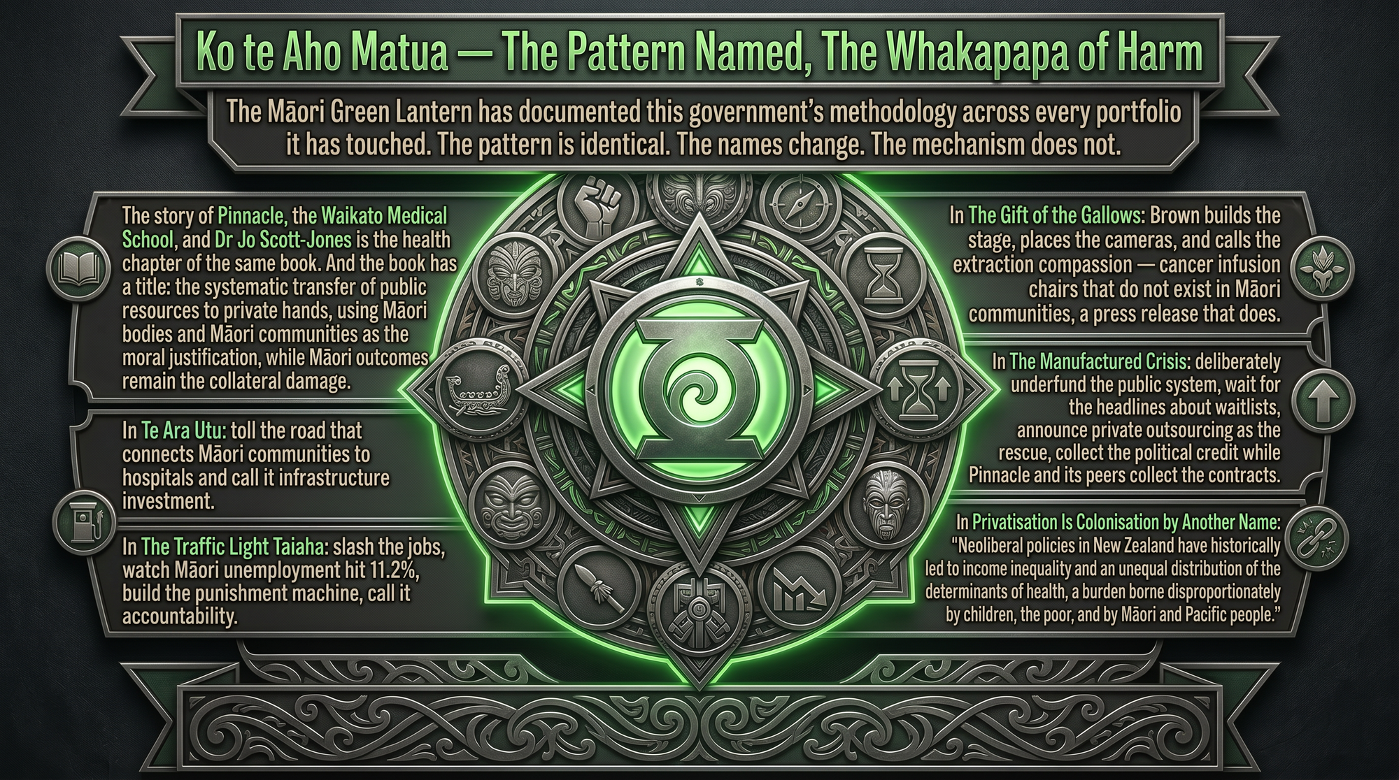 As the Māori Green Lantern examined in Neoliberal Vultures Circle as Health NZ Bleeds, this is the consistent pattern: manufacture the crisis, place the beneficiary in the advisory role, implement the policy, call the extraction "reform."