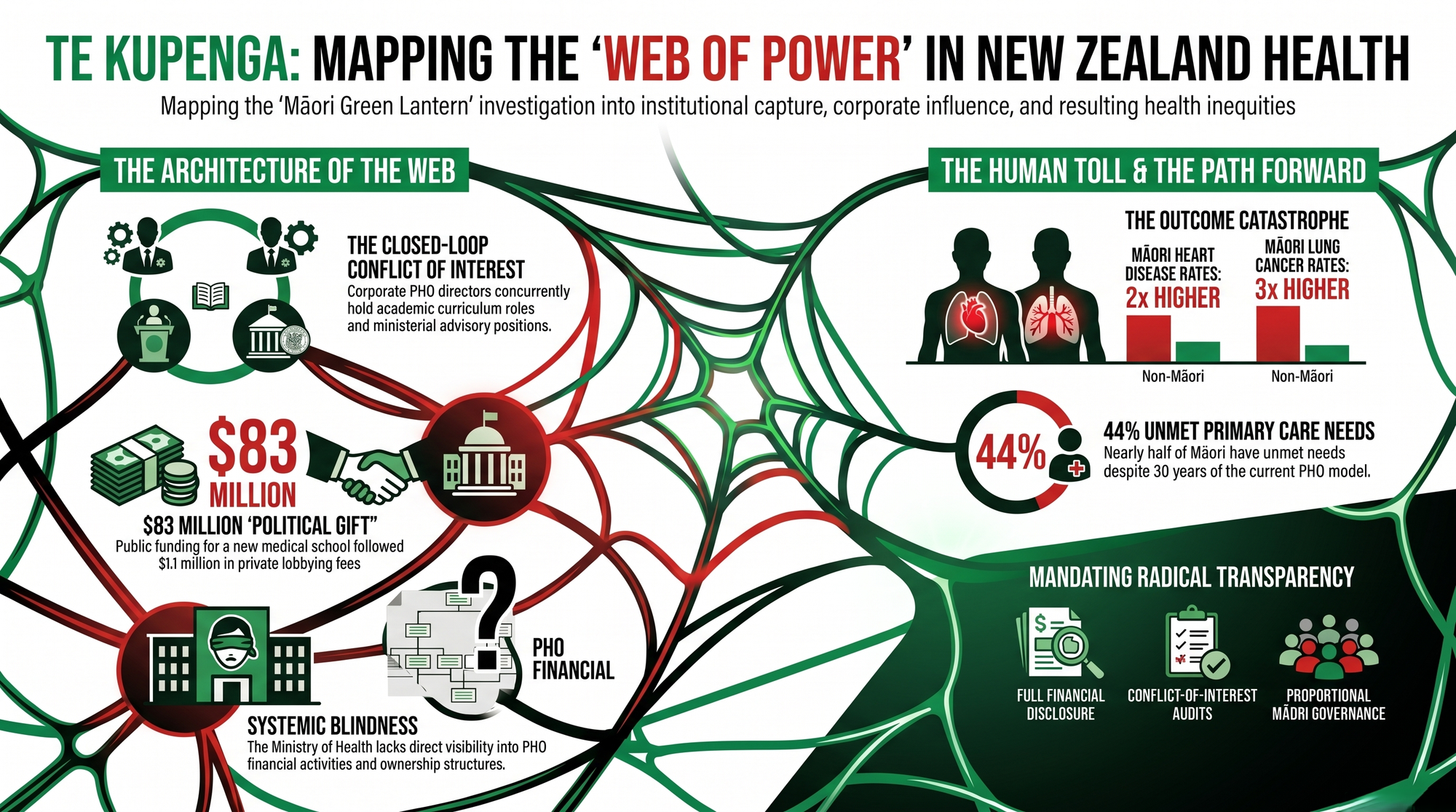 As the Māori Green Lantern exposed in Exposing Simeon Brown's Dangerous Health Agenda and The Privatisation of Public Health Through the Back Door, the creeping privatisation of public health has been the consistent, deliberate project of every National-aligned government since 1993. Scott-Jones did not invent this machine. He made himself indispensable to it — and that indispensability has been extraordinarily well rewarded.