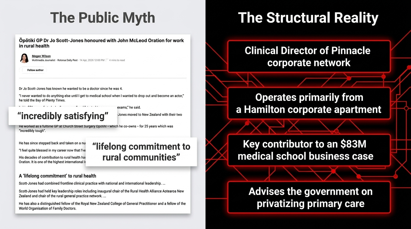 Strand Four: The Academic Appointment — Honorary Associate Professor, University of Waikato Division of Health, October 2024 — confirmed by Pinnacle Practices. Professor Ross Lawrenson confirmed he would be "an integral member of the team." Translation: the Clinical Director of the corporate network that will employ the graduates is shaping the curriculum of the school that trains them.