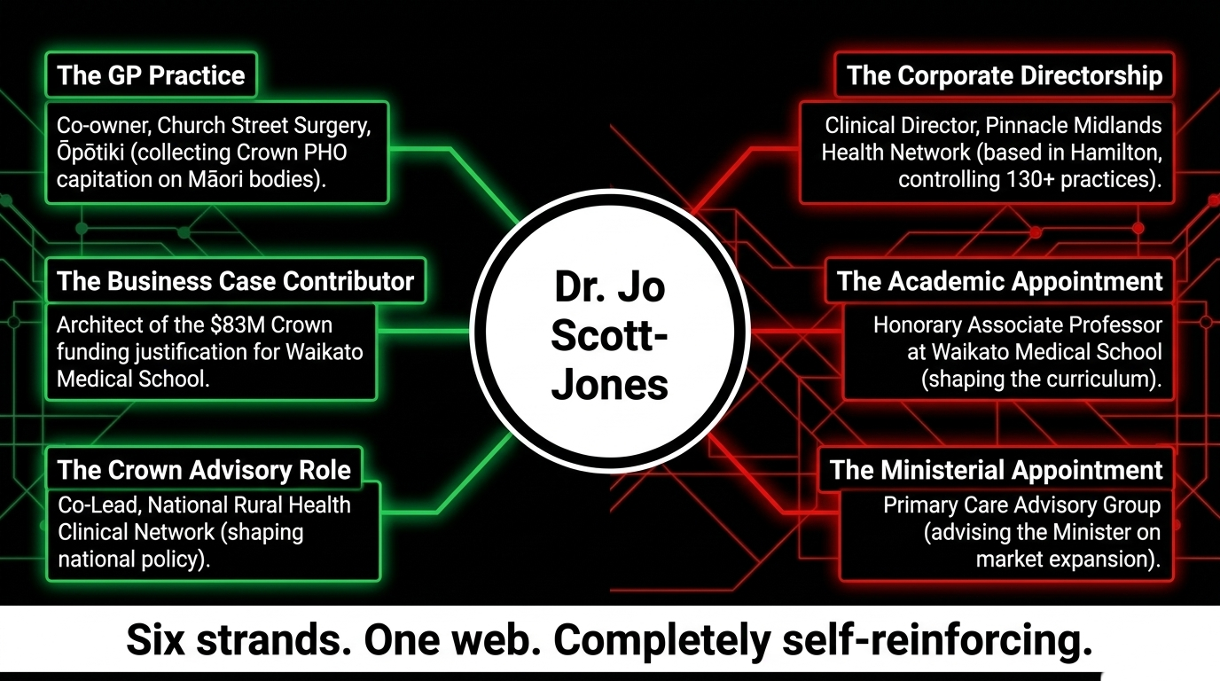The University of Waikato MOU formalises Pinnacle as a clinical placement partner. Scott-Jones — Pinnacle's Clinical Director — holds the academic appointment shaping the curriculum. The business case justifying $83M in Crown funding lists him as a named contributor. The graduates of this school will be professionally formed inside Pinnacle's ideological and commercial framework — and they will believe it is medicine, because it is all they will have seen.
