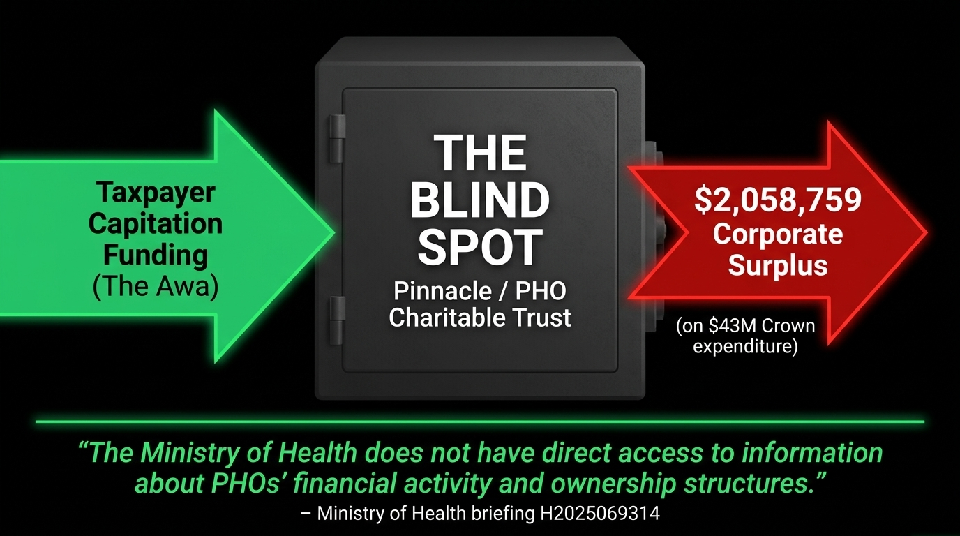 In Western terms: you pay taxes to fund universal healthcare. Your taxes flow to a PHO. The PHO flows to a charitable trust. Above the charitable trust sits a private corporate membership body — Pinnacle Incorporated — that controls the technology, training, and practice infrastructure the trust depends on. Pinnacle's 2019-20 annual report recorded a surplus of $2,058,759 on $43 million of Crown-sourced expenditure, as confirmed in Pinnacle's own Annual Report.