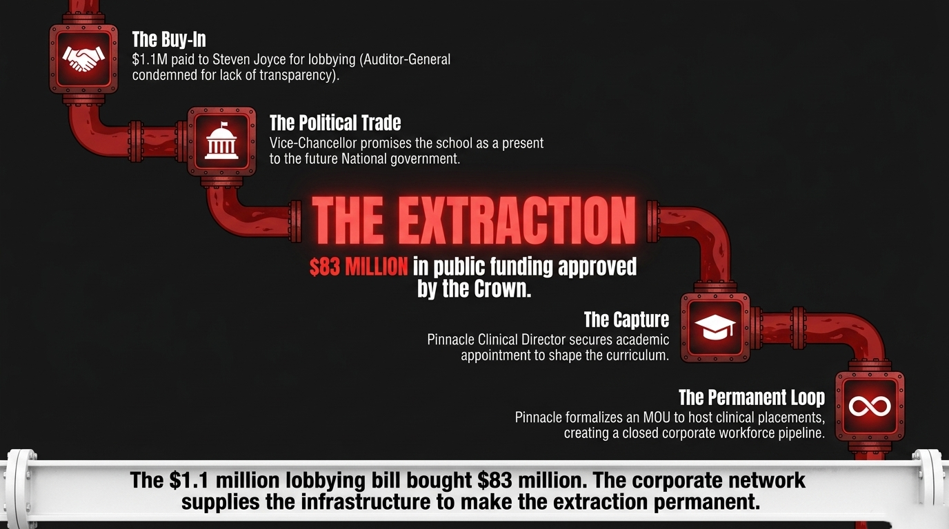 He then contributed to the business case justifying the funding. He then accepted the academic appointment from the institution that funding built. And in November 2024, Pinnacle formalised an MOU with the University of Waikato to host clinical placements across the Pinnacle network — meaning Pinnacle practices will train the graduates, Pinnacle ideology will shape their professional formation, and Pinnacle employment will be the natural destination of the workforce this school produces.