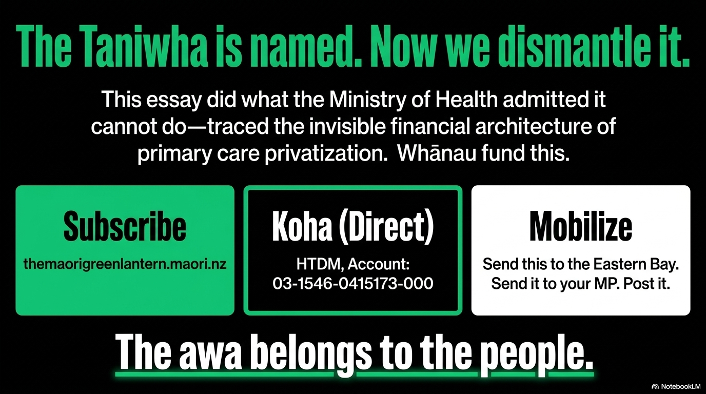 Every Māori body that died too early, every whānau that could not afford the co-payment, every rural community that watched its health outcomes stagnate while the corporate infrastructure above it grew sophisticated and profitable — these are Treaty breaches. Documented. Named. Unremedied.