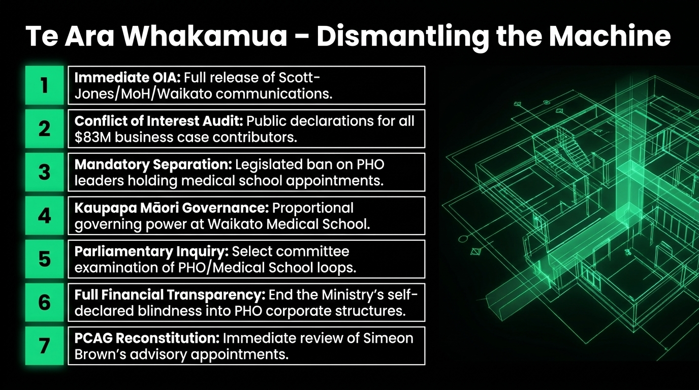 Only the last one happened, confirmed by the Beehive on November 2, 2025. Scott-Jones's corporate network stands to directly profit from every recommendation the PCAG makes about "shifting hospital care into the community." He is, in the most literal sense, writing the policy his company will implement, for the Minister who benefits politically from the privatisation it enables.
