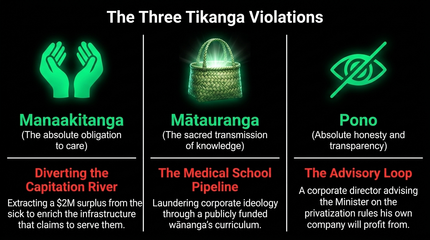 The tikanga violation is the desecration of pono — the absolute requirement of honesty and transparency in all things. Pono is not just personal integrity. It is the structural condition for trust between people, between communities, and between those who hold power and those over whom it is exercised. When the person advising on the rules is the person who profits from them, pono has been destroyed at the root. The whare cannot stand when its foundations are deception.