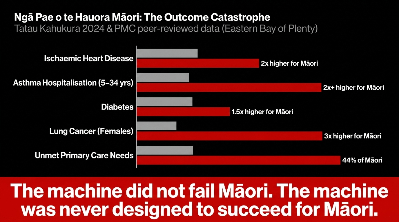 The Te Tauraki Independent Māori Statutory Board's 2025 Monitoring Report — covering the Eastern Bay of Plenty, the very takiwā where Scott-Jones has operated for three decades — confirms that Māori across the region experience persistently, catastrophically worse health outcomes than non-Māori across every major indicator: cancer, cardiovascular disease, diabetes, mental health, and access to primary care. Not marginally worse. Dramatically, measurably, preventably worse. After thirty years of the PHO model. After thirty years of Pinnacle. After thirty years of public money flowing through this architecture.
