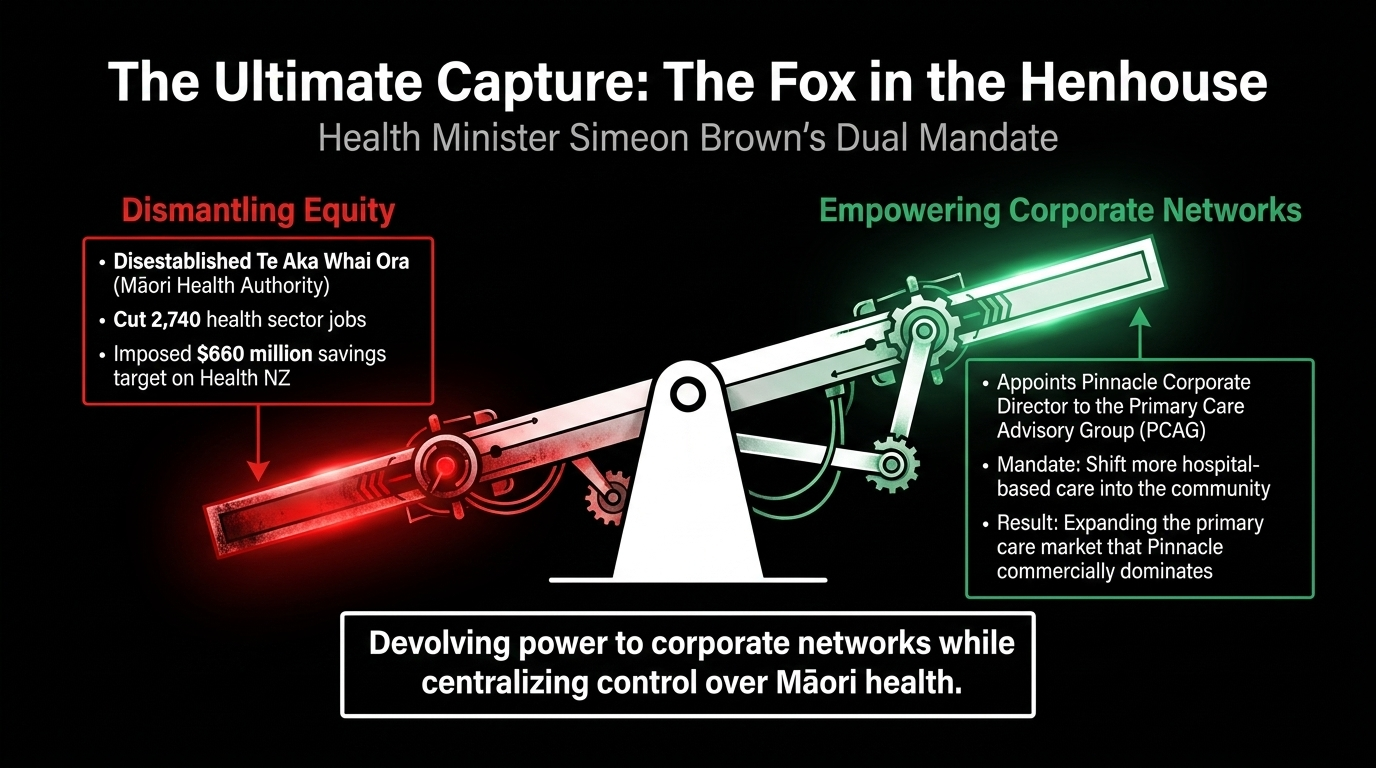 In E Rua Ngā Rangi, the Māori Green Lantern documented how Brown's model devolves power to Pākehā corporate networks while centralising control over Māori health decision-making. This PCAG appointment is that dynamic made flesh: a Pākehā corporate GP given ministerial advisory power over the primary care system that his company dominates, while Māori health providers — underfunded, understaffed, structurally excluded — watch from outside the room.